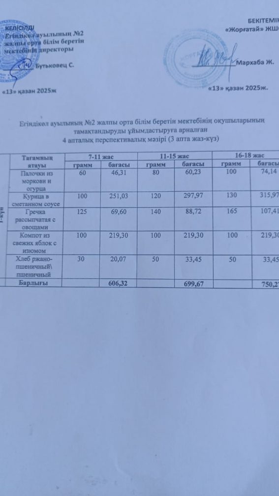 4 апталық мәзір (2-апта) Дүйсенбі