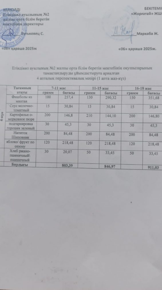4 апталық мәзір (1-апта) Бейсенбі