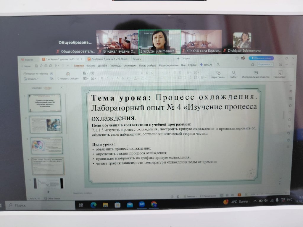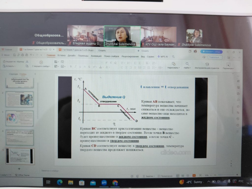 Сабақ барысында оқушылар заттар суыған кезде болатын құбылыстар туралы мағлұмат алды, өмірден мысалдар келтіре отырып талқылады, температура төмендеген кезде заттарда болатын өзгерістерді түсіндіруді үйренді.