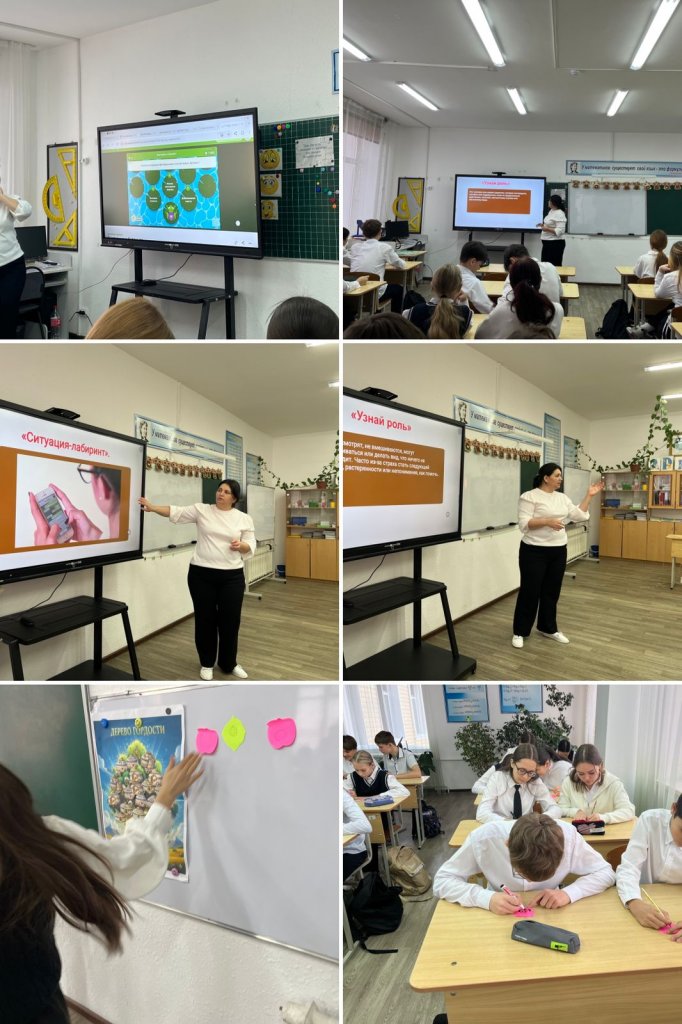 Сондай-ақ келесі сұрақтар қарастырылды: кибербуллингке қатысушы болсаңыз не істеу керек. Оқушылар агрессиямен жауап бермеудің, дәлелдемелерді сақтаудың, бұзақыларды блоктаудың және ересектер мен мамандардан көмек сұраудың маңыздылығы туралы білді. «Өзіңе алғашқы көмек» тақырыбы аясында өзін-өзі қолдау бойынша ұсыныстар берілді: сезімдер арқылы сөйлесу, әлеуметтік желілерден үзіліс жасау және достардан, ата-аналардан және мектеп психологынан қолдау іздеу. Сынып сабағы жауапкершілікті онлайн мінез-құлықты қалыптастыруға және қиын жағдайларда бірлік пен ынтымақтастықтың құндылығын түсінуге көмектесті.