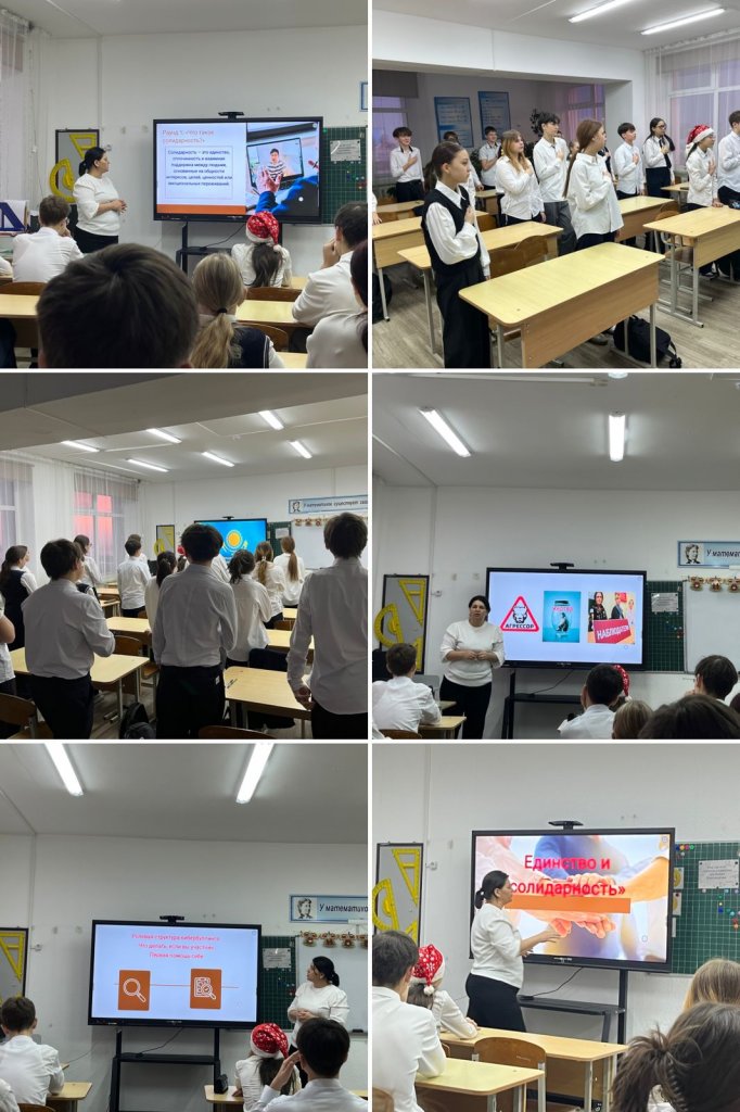 Білім беру жоспарына сәйкес, «Бірлік пен ынтымақтастық. Кибербуллингтің рөлдік құрылымы. Қатысушы болсаңыз не істеу керек. Өзіңізге алғашқы көмек» тақырыбында сабақ өткізілді. Сабақ барысында студенттер бірлік пен ынтымақтастықты, сондай-ақ қазіргі цифрлық әлемде қолдау мен өзара құрметтің неліктен маңызды екенін талқылады. Кибербуллингтің жасөспірімдердің психологиялық қауіпсіздігіне қауіп төндіретін мәселесіне ерекше назар аударылды.