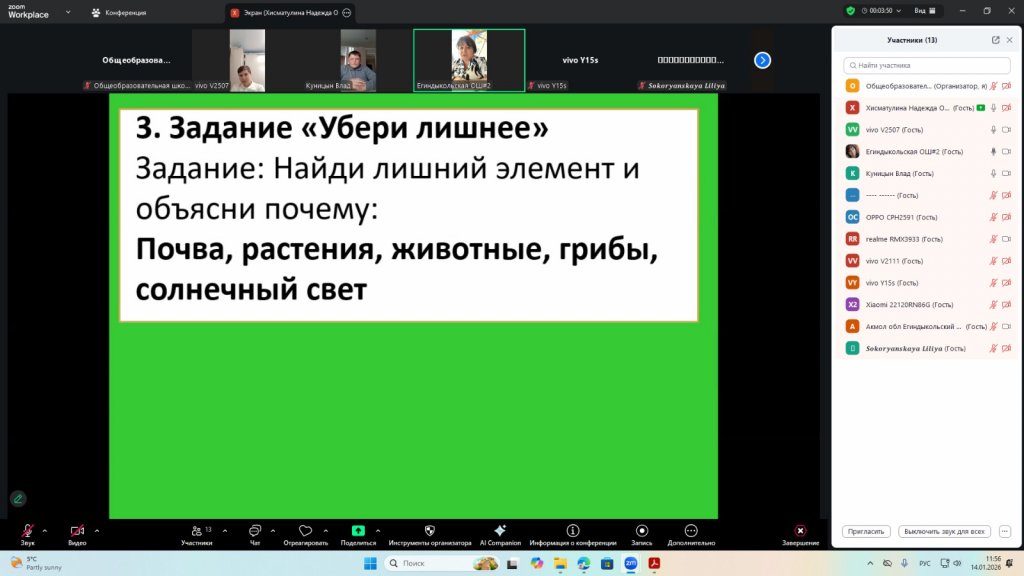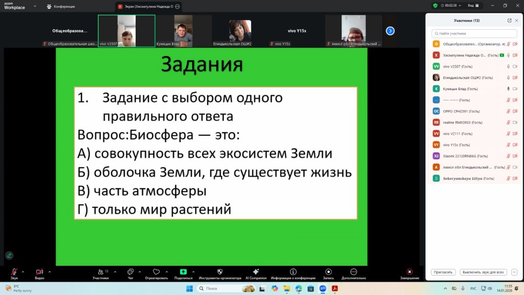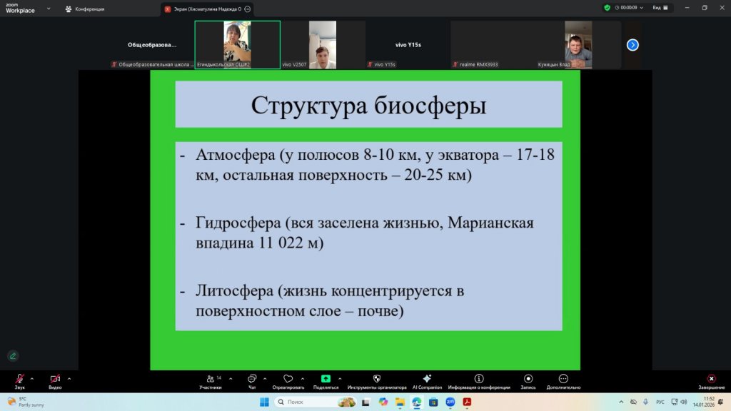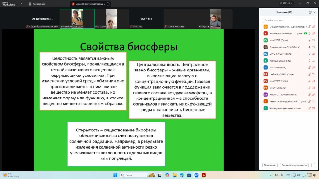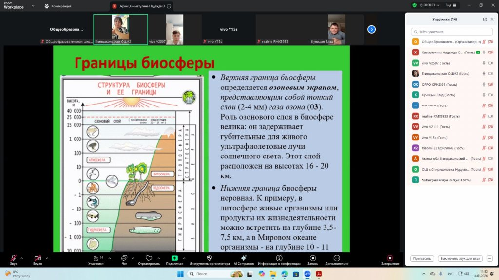Сабақ барысында оқушылар «биосфера» ұғымымен танысты, оның компоненттері мен олардың өзара байланысын зерттеді және Жер қыртысындағы тірі организмдердің рөлін зерттеді. Оқушылар тірі және тірі емес табиғаттың өзара әрекеттесуінің мысалдарын талдап, оқу материалдарымен және көрнекі құралдармен жұмыс істеді және биосфераның планетадағы тіршілік үшін маңыздылығы туралы қорытынды жасады. Оқушылар талқылауларға белсенді қатысып, практикалық тапсырмаларды орындады, бұл танымдық қызығушылықтың, қоршаған ортаға деген ойлаудың дамуына және теориялық білімді практикада нығайтуға ықпал етті.