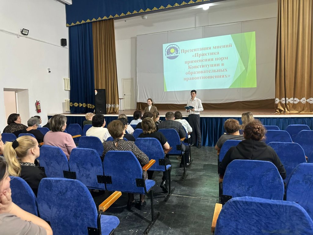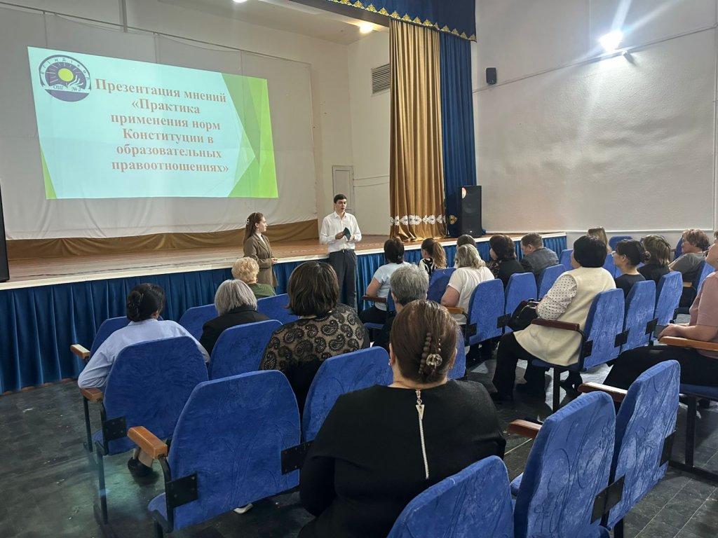 Білім беру саласындағы құқықтық қатынастарда Қазақстан Республикасы Конституциясының практикалық қолданылуын талқылау үшін мұғалімдермен кездесу өтті. Іс-шараның мақсаты мұғалімдердің кәсіби қызметінде конституциялық қағидаттардың рөлін талқылау, сондай-ақ білім беру процесіне қатысушылардың құқықтары мен заңды мүдделерін қорғау бойынша тәжірибе алмасу болды.