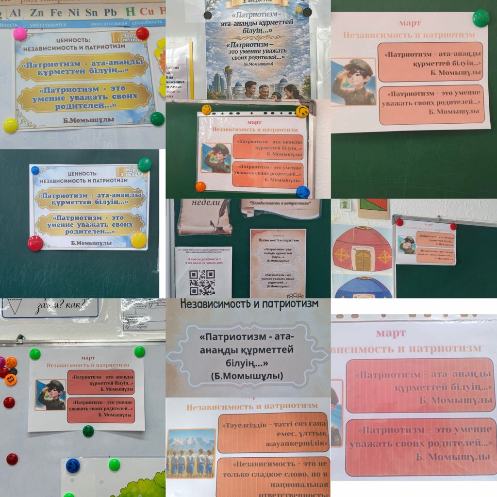 Сыныптарда ілінген дәйексөздер ойлану мен диалог үшін ерекше атмосфера жасайды. Үзіліс кезінде және сынып сағаттарында балалар патриотизмнің олар үшін нені білдіретінін және оның күнделікті өмірде қалай көрінетінін талқылайды: отбасына қамқорлық жасау, үлкендерді құрметтеу және өз іс-әрекеттері үшін жауапкершілік алу.
